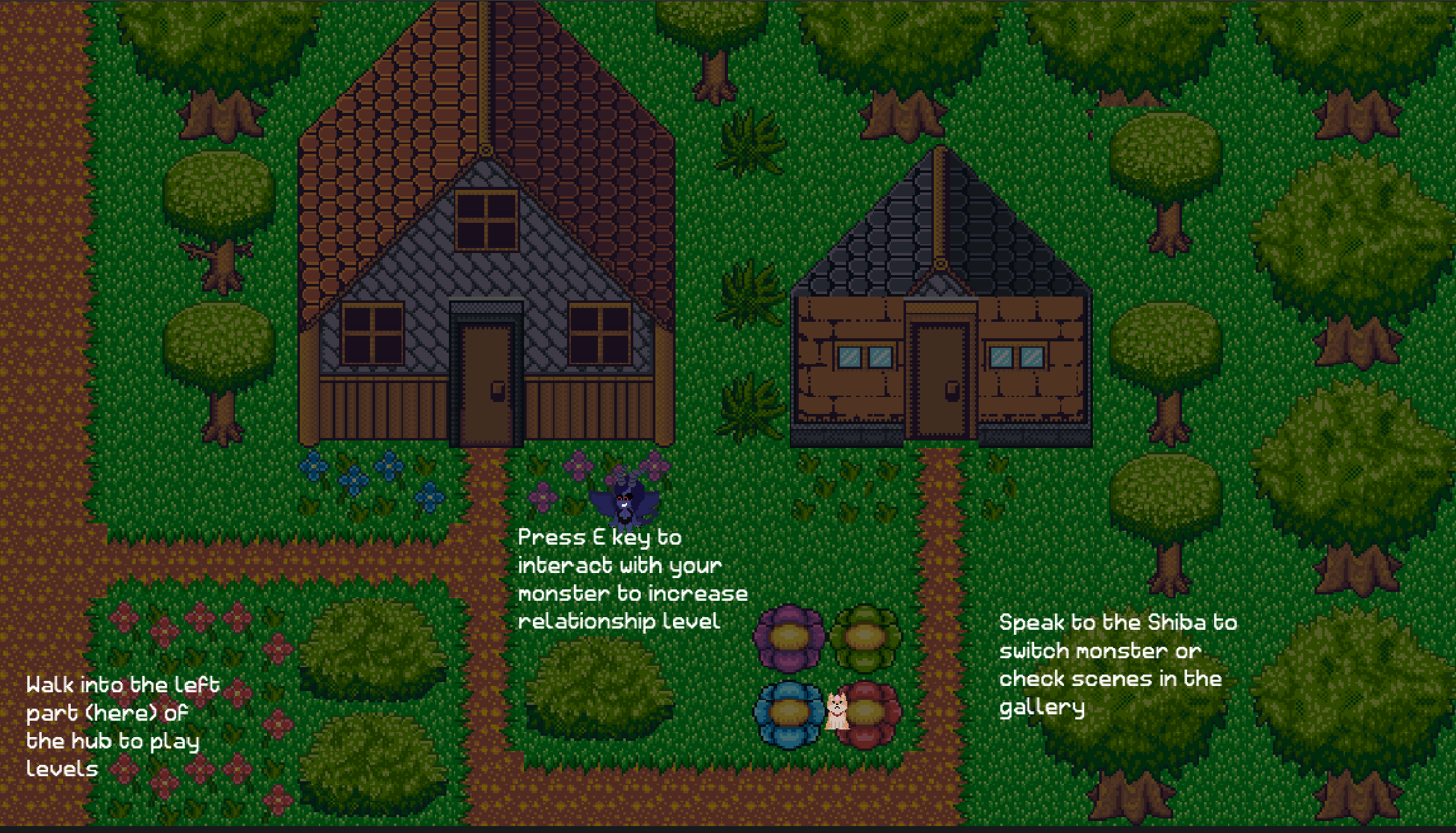 One day, your cozy life in the woods is uprooted when a group of cultists targets you for a reason unknown to you. A monster suddenly appears when they try to ambush you and protects you. You start living together with your monster and try to get to the bottom of this mystery. Deepen your bond (make sweet love!) and protect the forest.
